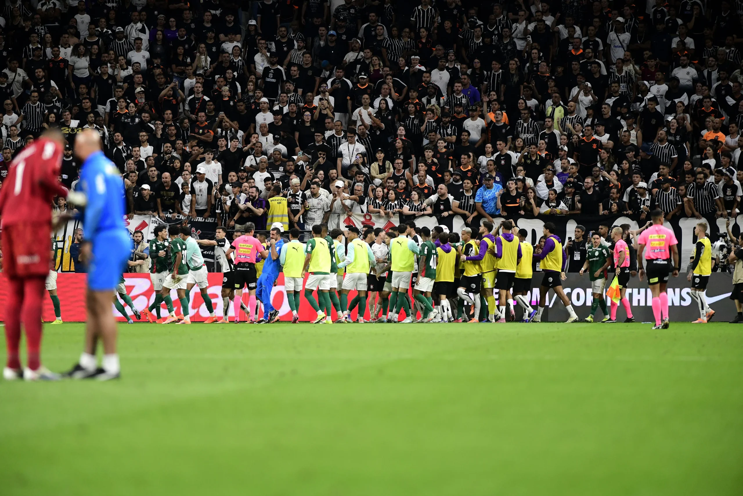 A vitória do Palmeiras por 1 a 0 sobre o Corinthians foi seguida por uma briga generalizada entre jogadores de ambas as equipes. Esse incidente resultou em denúncias contra o Palmeiras e o Corinthians, que podem ser penalizados com multas consideráveis. O clube alviverde enfrenta a possibilidade de pagar R$ 20 mil em uma das acusações e até R$ 100 mil em outra. O Corinthians também está sujeito a sanções financeiras devido ao seu envolvimento na confusão. Além dos jogadores e clubes, o gandula Alessandro da Silva também foi denunciado por supostamente ter chutado o jogador Sosa durante a briga, o que pode resultar em punições disciplinares.